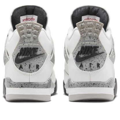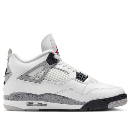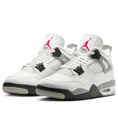 The iconic Air Jordan 4 "White Cement," a 1989 OG, returns in 2025. This highly anticipated release features a crisp white leather upper, grey speckled midsole, and signature black accents. Boasting original Nike Air branding and visible Air cushioning, it's a must-have for collectors and sneakerheads alike.