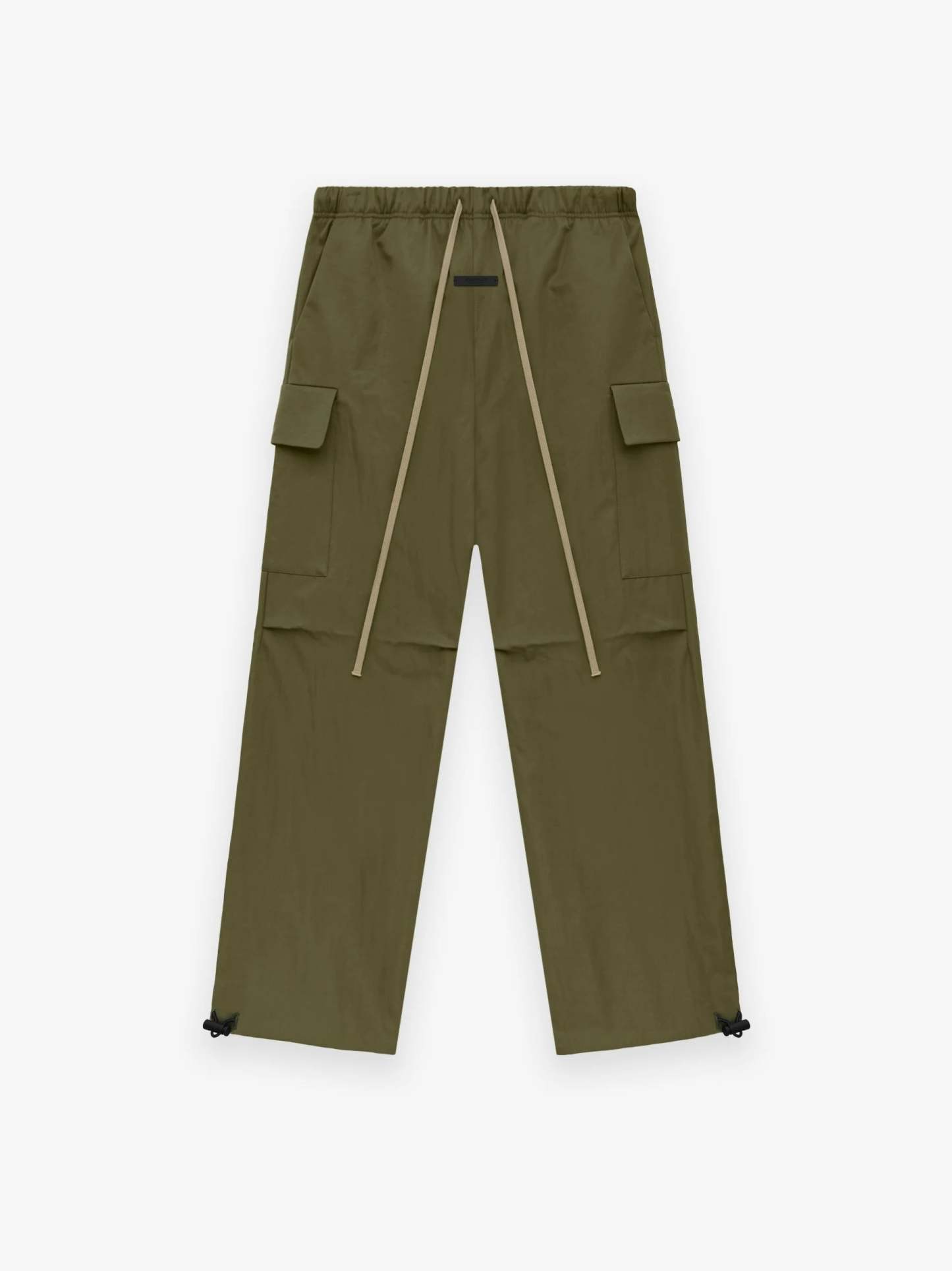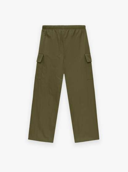 The Textured Nylon Field Pant is made from heavy crinkle nylon for bold structure and full perforated poly lining for comfort. The wide leg fit pant has cargo pockets, encased elastic waistband, elongated drawstring, side pockets, and ankle bungee cord for adjustability. Minimalist branding is seen in the Essentials Fear of God black bar at center front.
