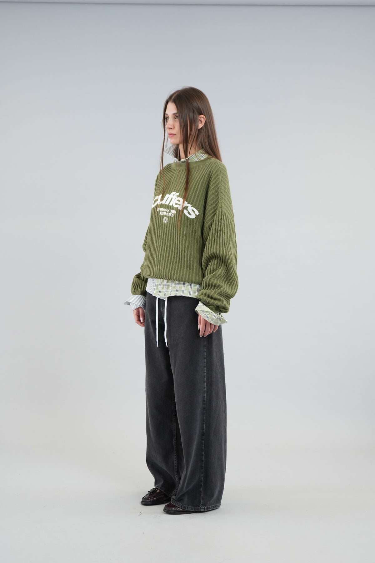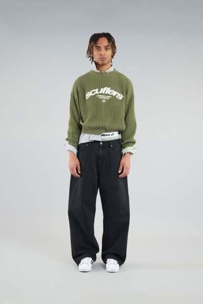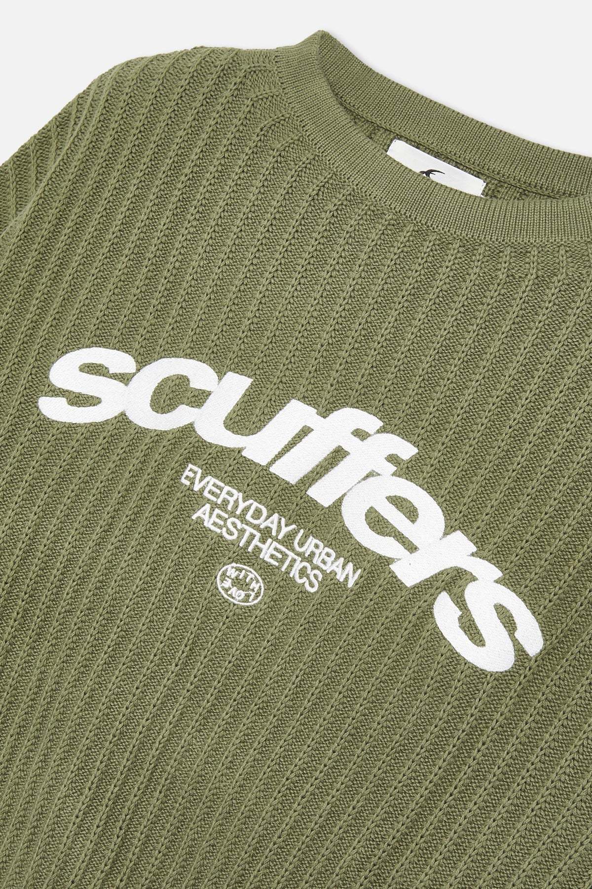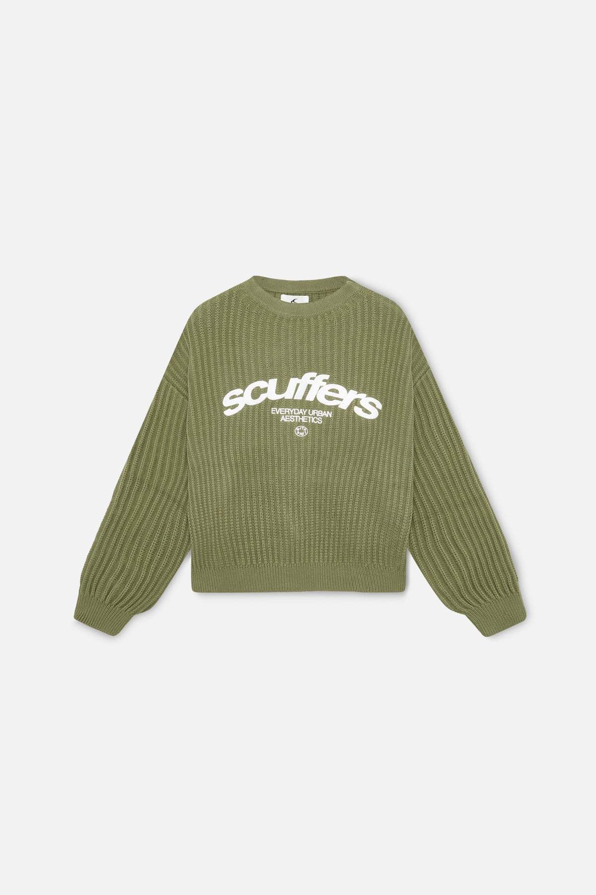 Oversized unisex caqui knit jersey. 'Scuffers', 'Everyday Urban Aesthetic' and 'With Love' logo on the front embroided in white.