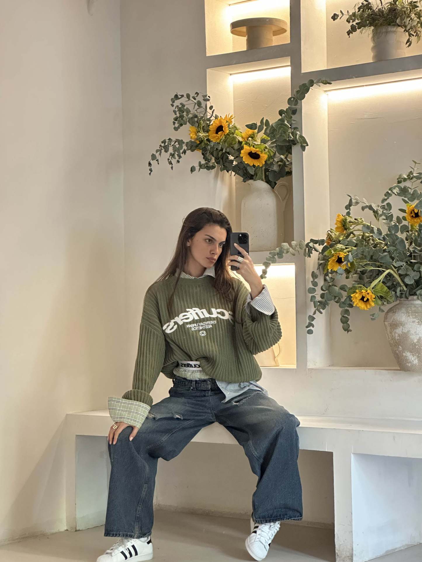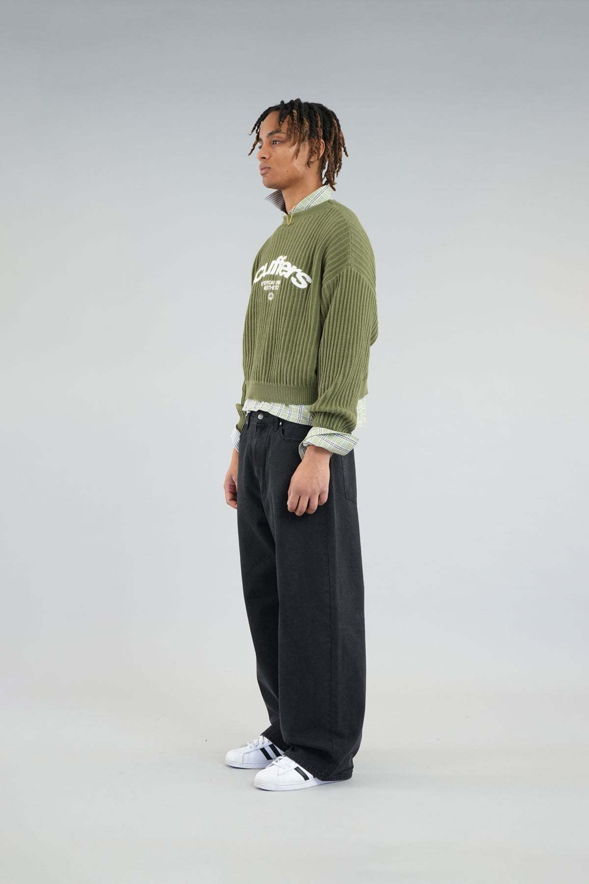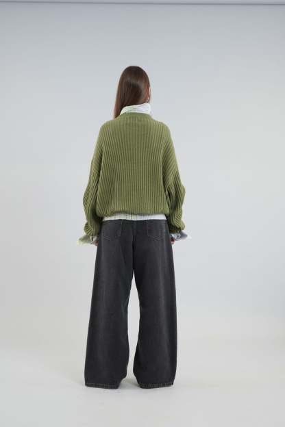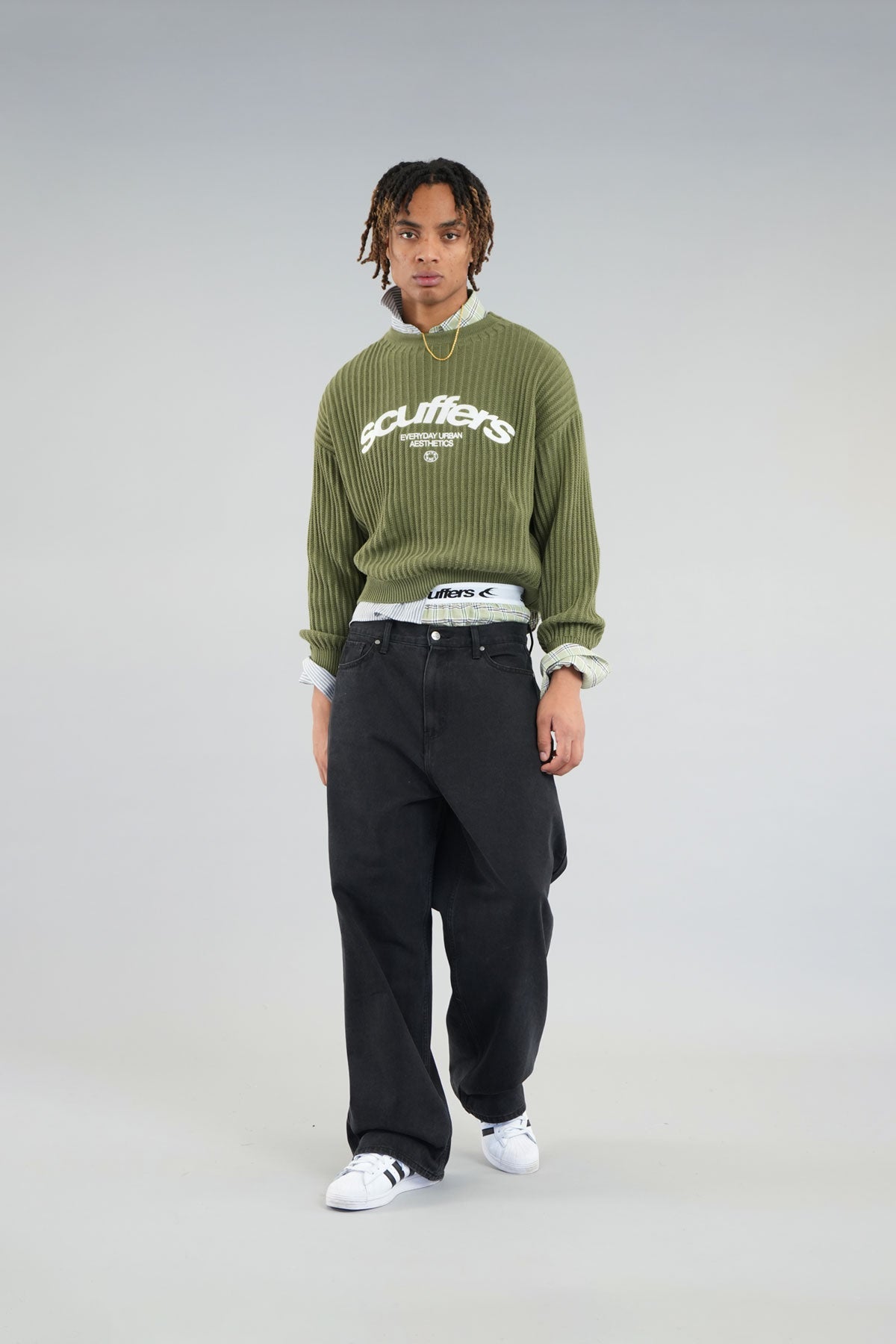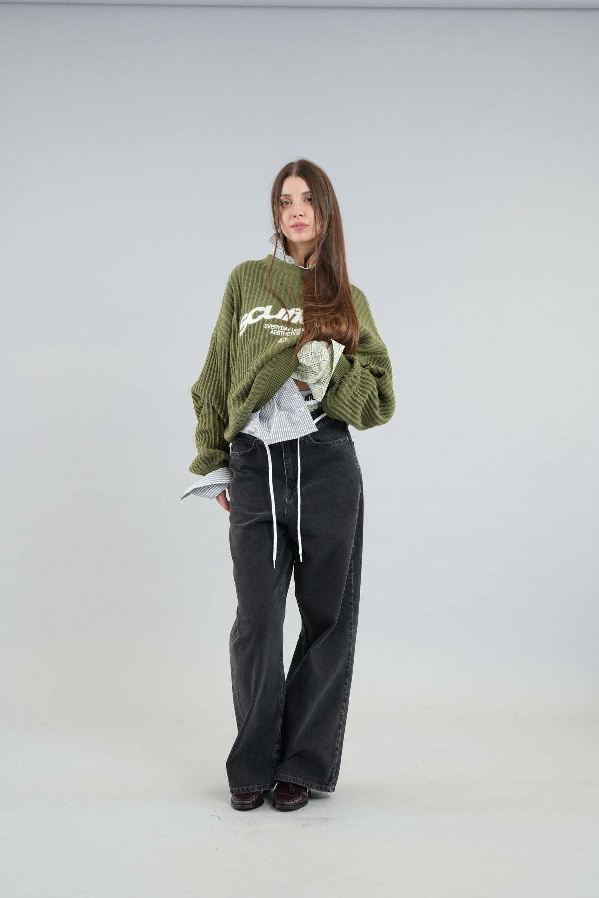 Oversized unisex caqui knit jersey. 'Scuffers', 'Everyday Urban Aesthetic' and 'With Love' logo on the front embroided in white.